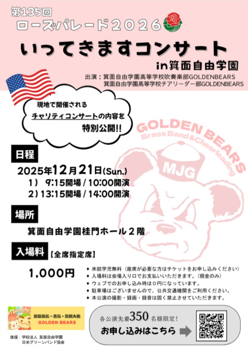 【トピックニュース】【🌹ローズパレード2026🌹いってきますコンサートin箕面自由学園 開催のご案内】✨🐻🥁 2025.12.15 箕面自由学園高等学校吹奏楽部・チアリーダー部のローズパレード出場が秒読みとなってまいりました🎵✨先立ちまして「いってきますコンサート」が開催されます!✨🐻🥁 詳細はこちら👇 Instagram お申し込みはこちら👇 第135回ローズパレード2026 いってきますコンサート in第135回ローズパレード2026 いってきますコンサート in